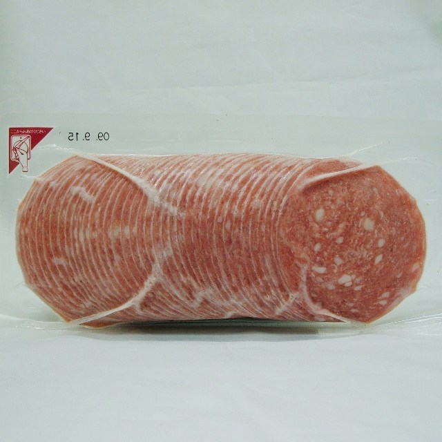 原材料名:豚肉、豚脂肪、食塩、砂糖、香辛料、たん白加水分解物、酵母エキス、加工デンプン、結晶セルロース、調味料(アミノ酸等)、酸化防止剤(V.C、V.E)、くん液、発色剤(亜硝酸Na)、着色料(コチニール)、(原材料の一部に乳成分、大豆を含む)
